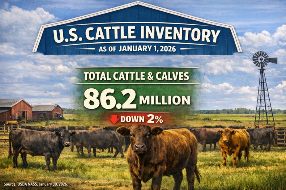 2. U.S. Department of Agriculture, National Agricultural Statistics Service, “Cattle,” released January 30, 2026.