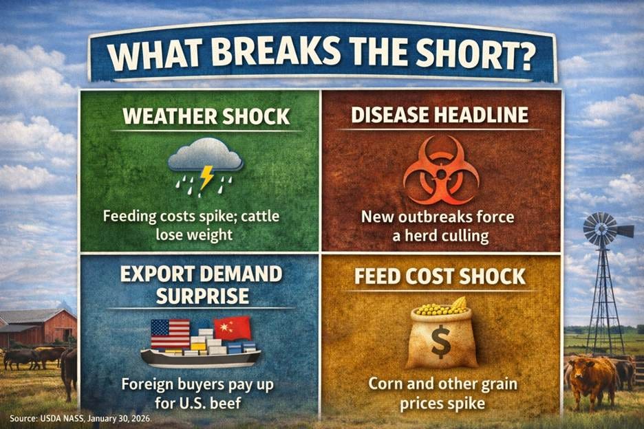 The short thesis is simple: live cattle prices can fall even if the herd stays tight. Futures don’t need abundant cattle to move lower; they need a catalyst that changes the balance of power between buyers and sellers.